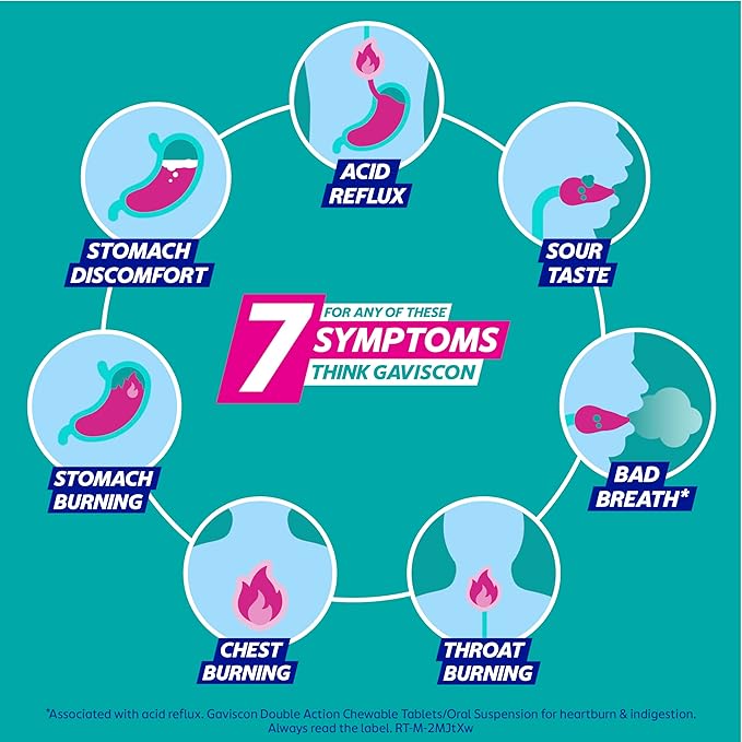 Gaviscon Double Action Mint Tablets bring fast, soothing and long lasting relief from heartburn and indigestion. They get to work in two different ways: Neutralising excess stomach acid to help relieve discomfort (white layer). Forming a protective barrier over the stomach contents to help soothe burning sensation in your chest (pink layer). So, whatever your symptoms of heartburn or indigestion Gaviscon double action can help provide fast, soothing relief. The tablets do not contain sugar or gluten. You can take this product if you are pregnant or breast-feeding.